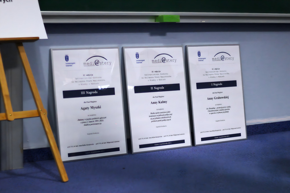Ważnym momentem konferencji jest wręczenie nagród laureatom ogólnopolskiego konkursu Medi@stery za najlepszą pracę magisterską z wiedzy o mediach. Konkurs jest cyklicznie organizowany przez Instytut Mediów, Dziennikarstwa i Komunikacji Społecznej UG i został zainicjowany w celu promowania najwybitniejszych prac absolwentów magisterskich studiów dziennikarskich. Laureatką pierwszego miejsca w 11. edycji konkursu została Anna Grabowska za pacę: „Art. Branding – promocja przez sztukę. Charakterystyka i analiza zjawiska w oparciu o wybrane przykłady” (promotor: dr hab. Weronika Świerczyńska-Głownia, prof. UJ, Uniwersytet Jagielloński). Drugie miejsce zajęła Anna Kulma za pracę „Media społecznościowe jako instytucja socjalizacji politycznej na przykładzie młodzieżówek polskich partii politycznych” (promotor: prof. dr hab. Agnieszka Hess, Uniwersytet Jagielloński). Trzecie miejsce przypadło Agacie Myszce za pracę: „Zmiany w języku polskich ogłoszeń o pracę w latach 1995-2024. Analiza porównawcza” (promotor: dr hab. Magdalena Hodalska, prof. UJ, Uniwersytet Jagielloński). Nagrody wręczyły: dyrektorka Instytutu prof. Małgorzata Łosiewicz oraz wicedyrektorka – dr hab. Anna Ryłko-Kurpiewska, prof. UG. Rozmowę z laureatkami poprowadziła Paulina Kozień, studentka dziennikarstwa i komunikacji społecznej UG. Główną nagrodą dla laureata pierwszego miejsca jest publikacja zwycięskiej pracy w formie książki, a w czasie uroczystości wręczenia nagród Medi@stery publiczność ma możliwość wysłuchania fragmentów wydanej pracy z poprzedniej edycji. W tym roku odczytany został fragment książki Agnieszki Kurpias: „Krytyka literacka w mediach społecznościowych” (promotor prof. dr hab. Iwona Hofman, Uniwersytet Marii Curie-Skłodowskiej w Lublinie), która została laureatką konkursu w 2024 roku.