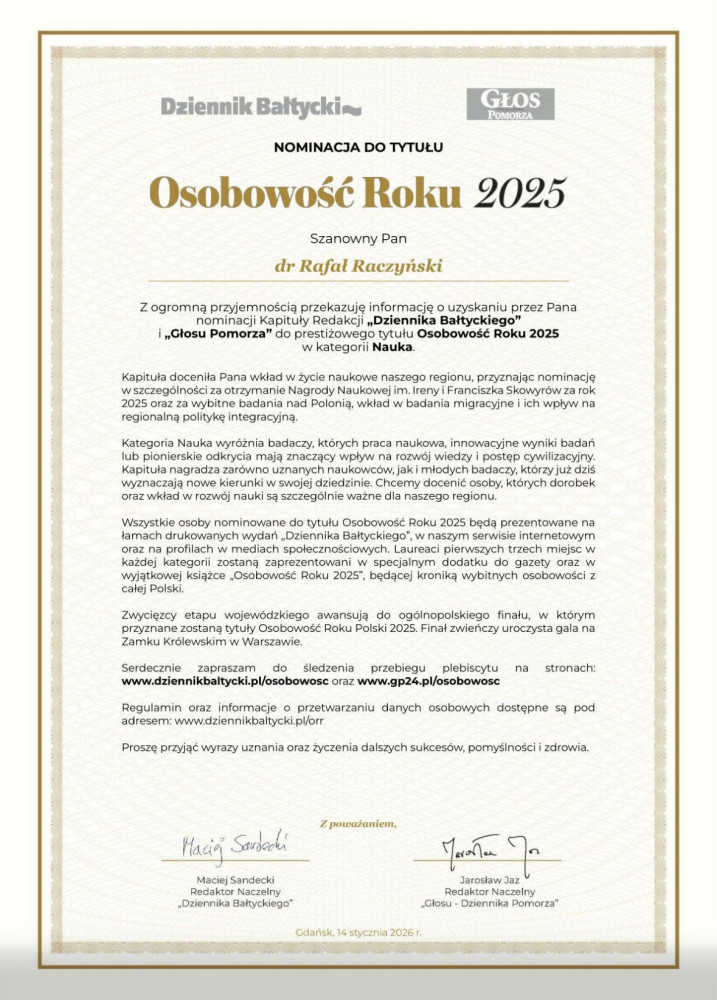 Z przyjemnością informujemy, że dr Rafał Raczyński, pracownik Wydziału Nauk Społecznych Uniwersytetu Gdańskiego, otrzymał nominację Kapituły Redakcji „Dziennika Bałtyckiego” i „Głosu Pomorza” do tytułu Osobowość Roku 2025 w kategorii Nauka.