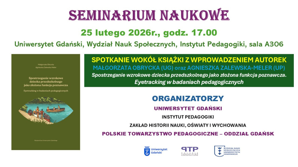 Instytut Pedagogiki Wydziału Nauk Społecznych Uniwersytetu Gdańskiego zaprasza na seminarium naukowe połączone z prezentacją nowej książki pt. „Spostrzeganie wzrokowe dziecka przedszkolnego jako złożona funkcja poznawcza. Eyetracking w badaniach pedagogicznych”.