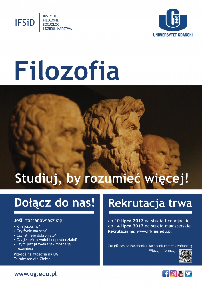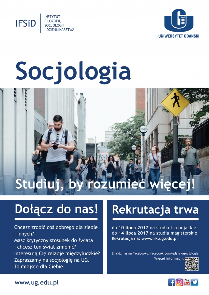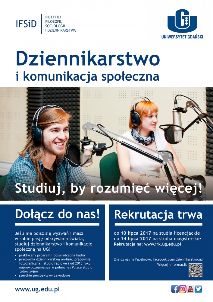 Szukasz studiów, które poszerzą Twoje horyzonty myślowe i nauczą krytycznego myślenia? Chcesz zdobyć wiedzę i praktyczne umiejętności, by być atrakcyjnym na rynku pracy? Zapraszamy do Instytutu Filozofii, Socjologii i Dziennikarstwa na Wydziale Nauk Społecznych Uniwersytetu Gdańskiego. Rekrutacja na stacjonarne studia licencjackie trwa do 10, a na studia magisterskie do 14 lipca! Na studia niestacjonarne zapraszamy do września 2017 r.